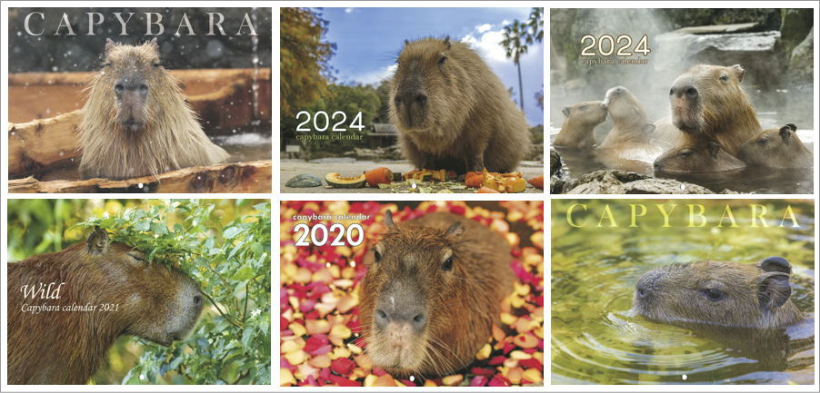 カピバラが主役のカレンダーを長崎バイオパーク・伊豆シャボテン動物公園・那須どうぶつ王国・神戸どうぶつ王国内の売店やお土産売り場にて販売して頂いております。A4サイズ開きA3サイズの壁掛けタイプです。