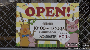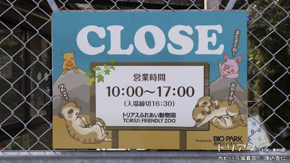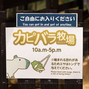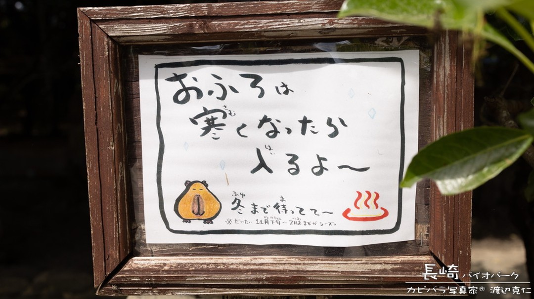 開園と閉園をお知らせする看板。カピバラも頑張って営業しています。