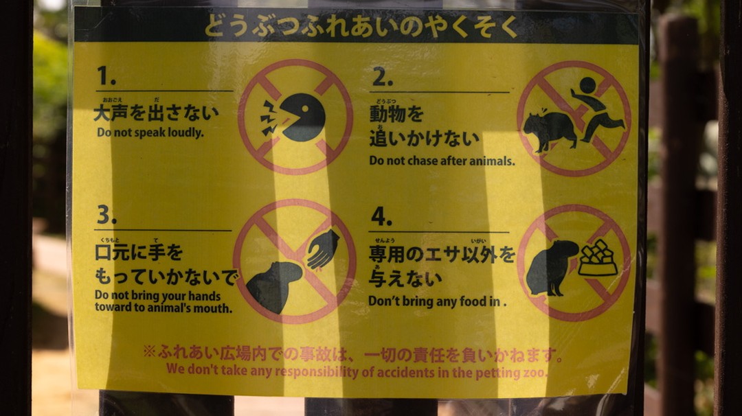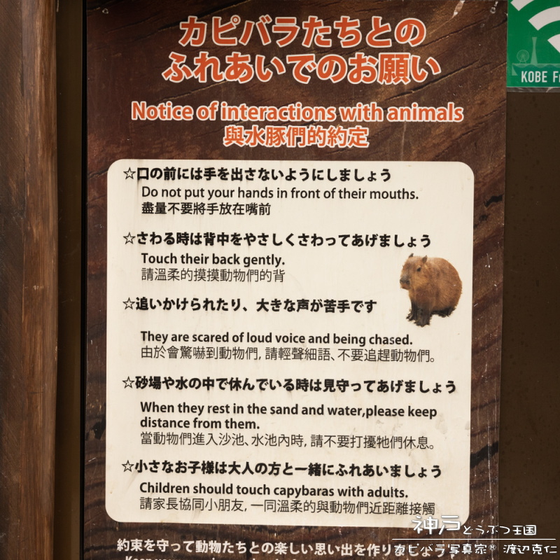 カピバラふれあい放飼場にある注意書き看板2枚。文字でしっかり記載されているタイプと写真とイラストを用いて直感的に伝えるもの。どちらも同じカピバラが出演している。注意事項はお客さんとしては本当に有難い。