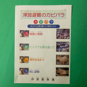 シャボテン動物公園と伊東警察署のコラボチラシ。津波避難の心得をカピバラを標語にしている。