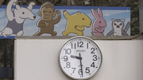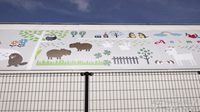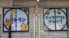 千葉市動物公園の入場ゲートの上に描かれている動物のイラスト。真ん中の茶黄色の動物は熊?なんだろう?私としてはカピバラだと信じたい。