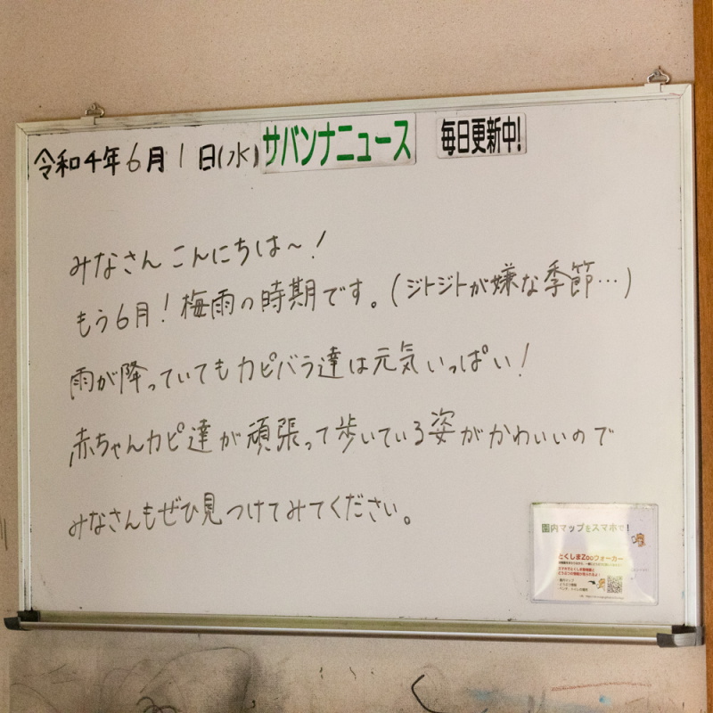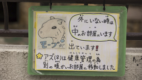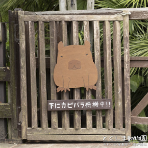 カピバラ放飼場に続く扉。お客様が入場出来ない時間はお尻を向けているのだが、入場化の時間帯は、待機中の文字と共に可愛い姿を見せてくれる、ナイスアイディア。