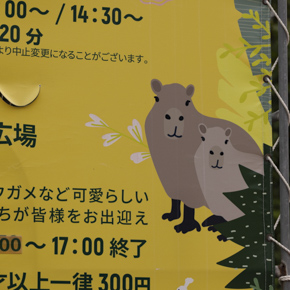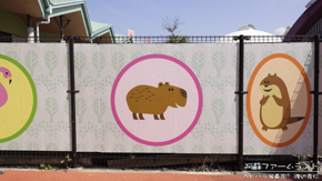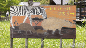カピバラのイラストが看板にあることで、柔らかい看板に。千葉市動物公園。