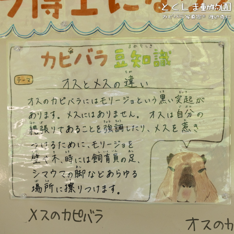 カピバラの個体紹介と一緒に生態の解説も。イラストがメインとで文字が小さいのは逆に何が書いてあるか気になります。千葉市動物公園